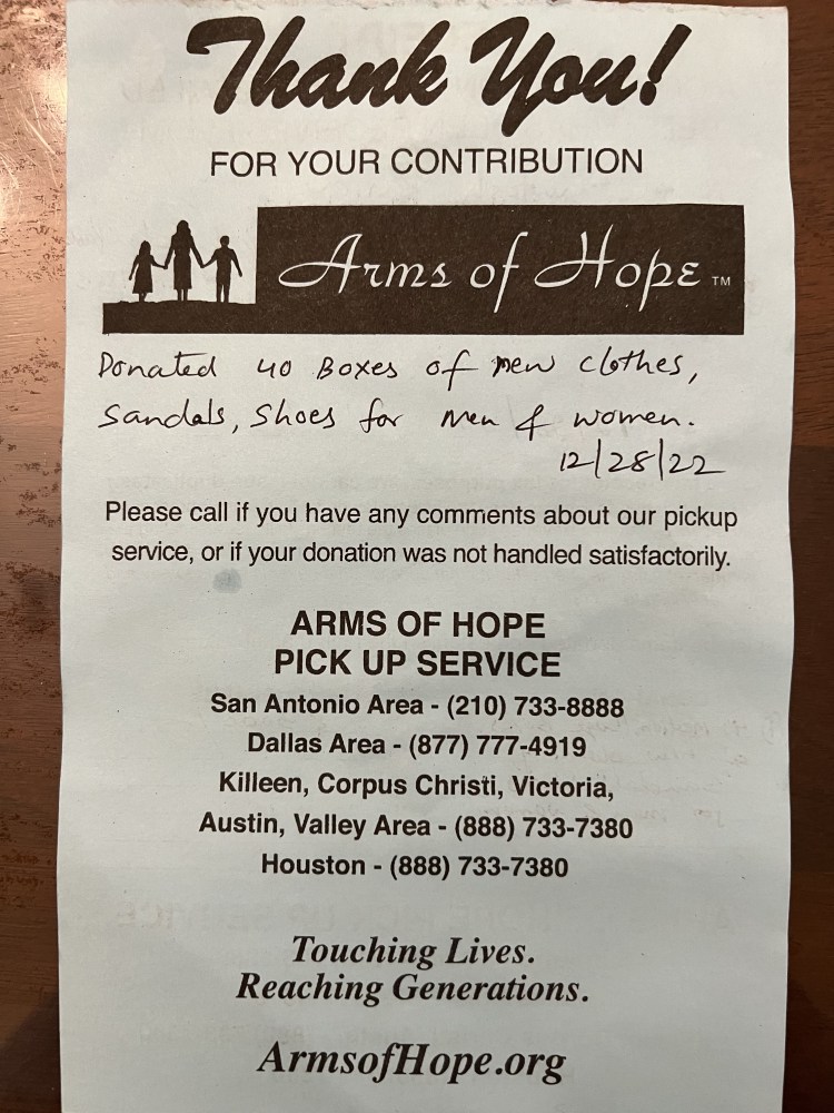 15. Holiday Donation & volunteering Events: We partnered with local Walmart stores to accomplish several hugely successful donation events to wrap up 2022 on a high note. The donations (15 pallets: 120+ medium/large cardboard boxes of new clothes, shoes, and sandals for babies, toddlers, boys, girls, men, and women) benefitted several organizations in the Austin area.